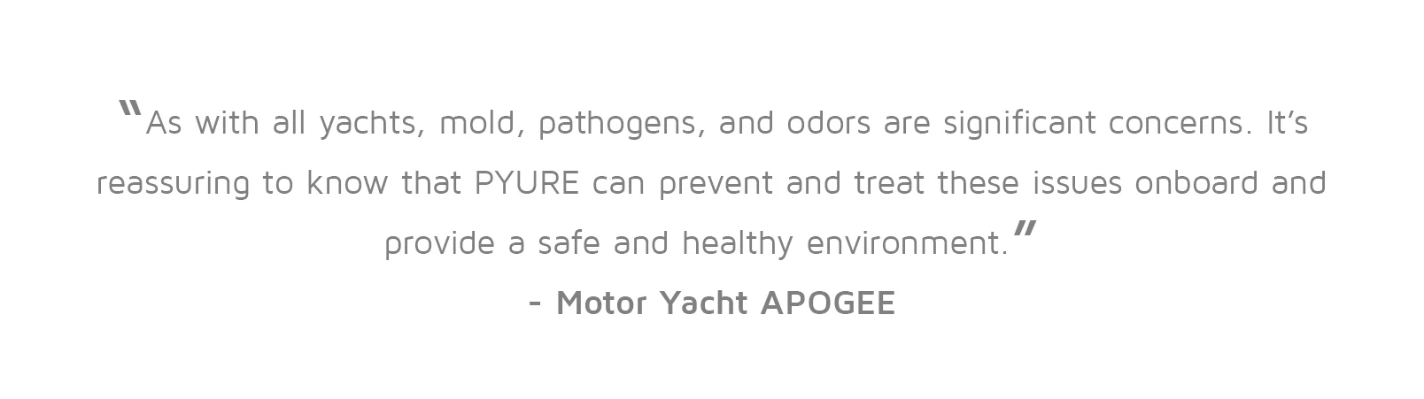 Pyure Dynamic Protection® is a game-changer for the maritime industry. As health and safety become more prevalent for those onboard, our air purification solution takes center stage to ensure that the air and surfaces onboard remain COVID-19 and contaminant free through continuous sanitation.